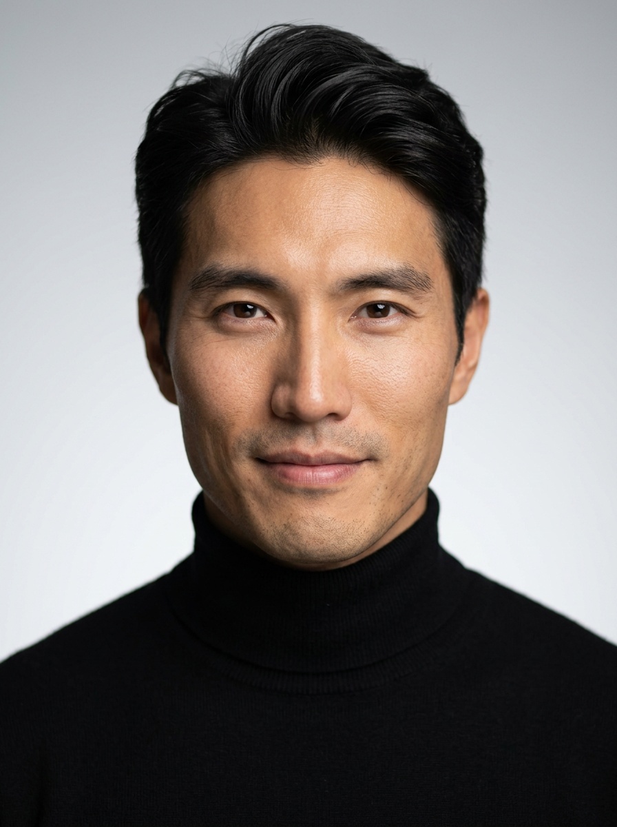 Professional AI LinkedIn headshot in Fitted black turtleneck on Neutral Gradient / Light Grey. Generated from one selfie with Looksmith.